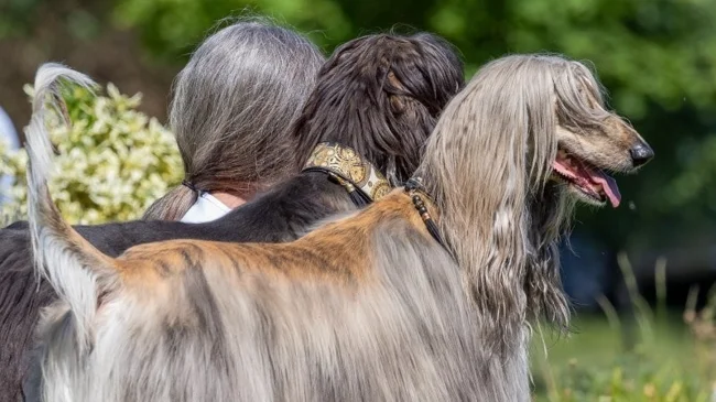 Женщина и её афганские борзые выглядят одинаково изящно и восхитительно.