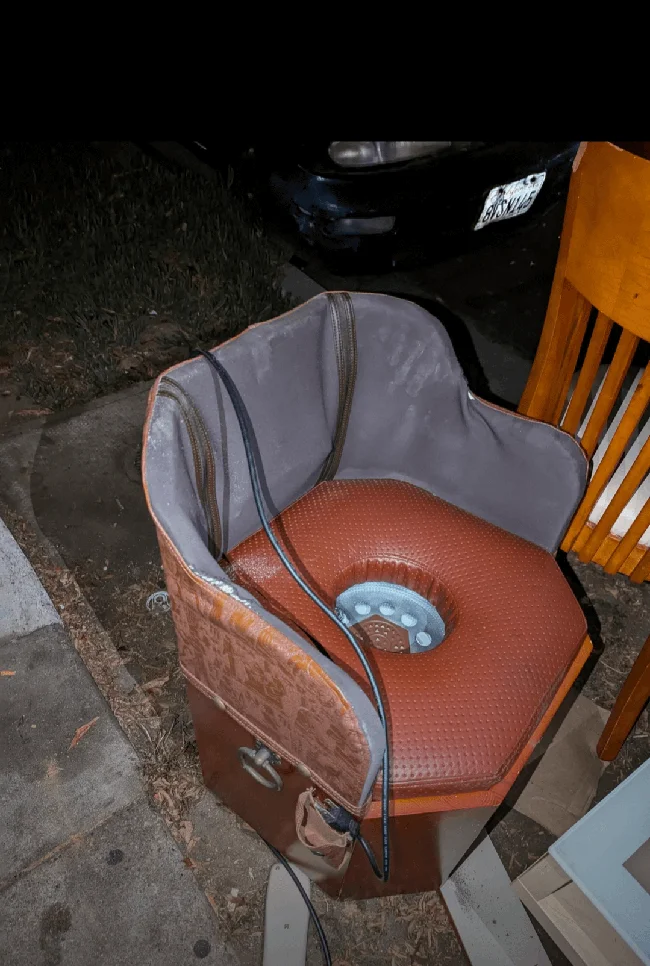 5. Что-то вроде кресла для отдыха с отверстием в сиденье, за которым скрывается какой-то мотор или устройство, и есть шнур, который можно подключить к розетке. Его выкинули соседи