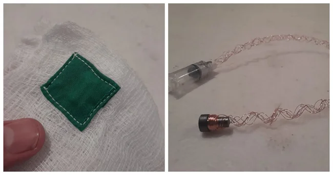 Эта медицинская повязка называется Raytec и представляет собой губку, используемую в хирургии. Эта деталь - RFID-метка. Она используется для поиска губки, если она осталась внутри пациента, так как она может пропитаться кровью и ее может быть очень трудно разглядеть. Обычно в конце процедуры проводится сканирование, чтобы убедиться, что внутри не осталось губок.