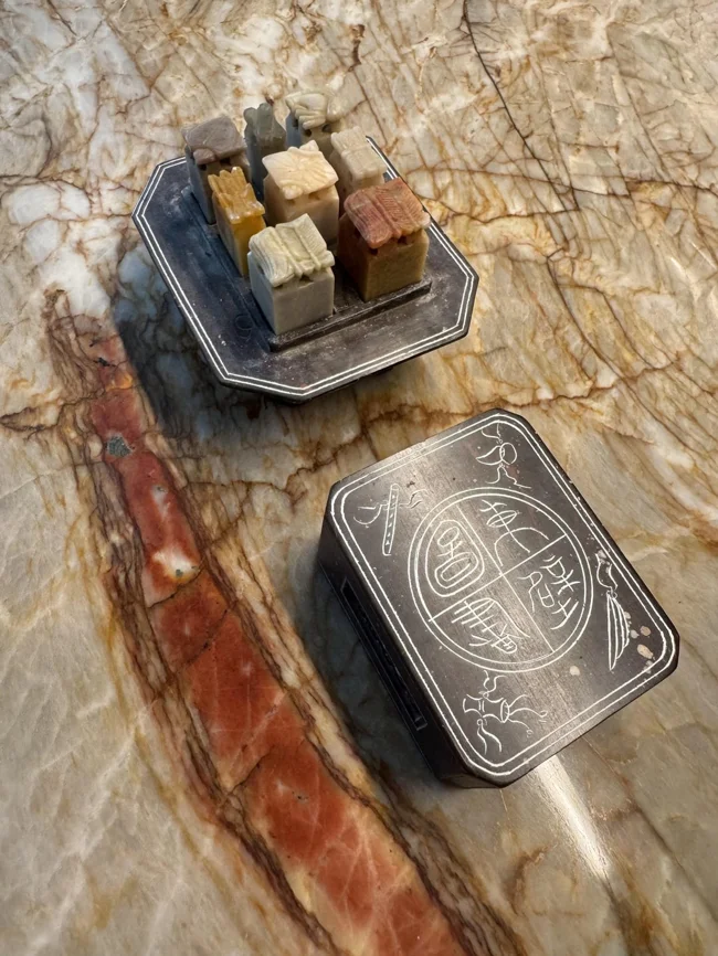 Это набор печатей или штампов. Если нижняя часть каждого маленького кусочка гладкая, вы можете вырезать на них своё имя. В Азии их используют также, как мы используем подписи - для подписания официальных документов и заключения юридически обязательных контрактов.