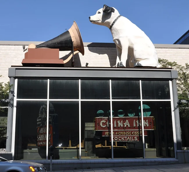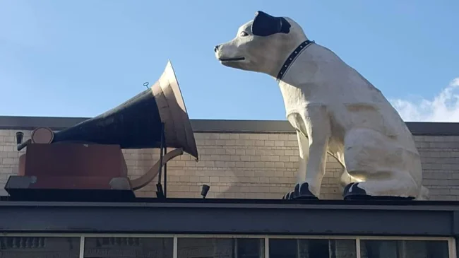 Забавная статуя талисмана RCA стоит на крыше исторического общества и заряжает позитивом прохожих.