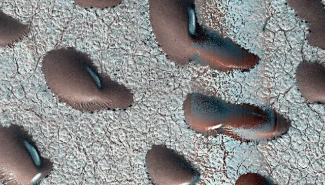 Опубликованы снимки с аппарата Mars Express и зонда Mars Reconnaissance Orbiter. Технически это не снег, а лед из углекислого газа, нагретый солнечный светом. В этом процессе лед переходит в газообразное состояние. Снимки были сделаны в летнее время, когда температура опустилась до -125 °C.