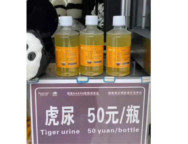 Китайский зоопарк Яань Бифэнся в Сычуани начал продавать красивые яркие бутылки с… да, тигриной мочой. Стоит такая радость 50 юаней за бутылку 250 мл. При этом он утверждает, что она помогает от ревматизма.