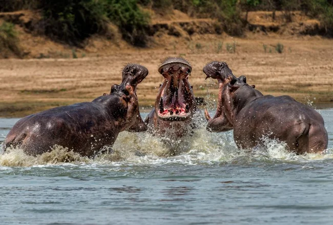 В отличие от многих других животных, драки самцов бегемотов действительно кровавые и яростные. Соперники часто заканчивают бой с серьезными ранами от клыков друг друга.