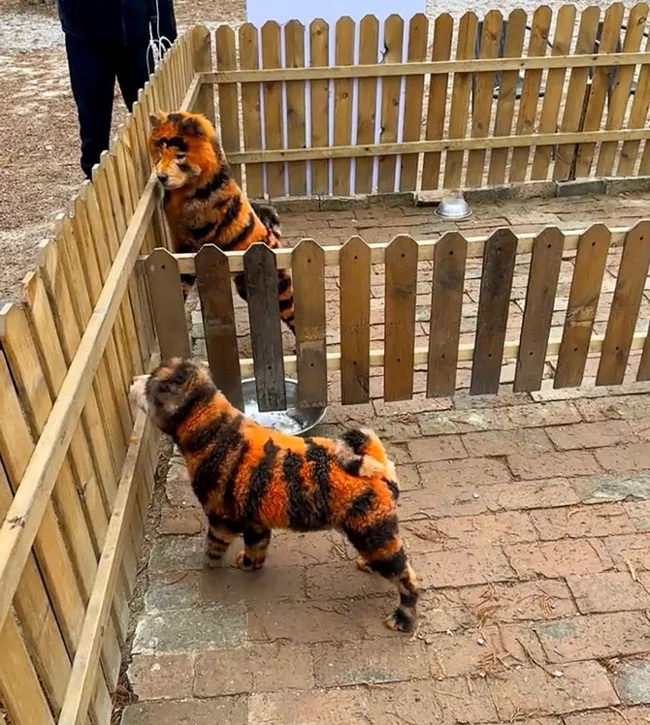 На кадрах, снятых в зоопарке Тайчжоу (провинция Цзянсу), можно увидеть, как песики с монобровью, окрашенные в оранжевый цвет с черными полосами, гуляют по двору, обнюхивают территорию и опираются передними лапками на забор.