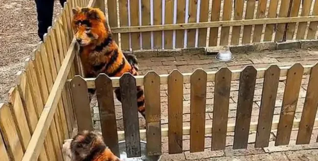 На опубликованных кадрах можно увидеть, как песики, окрашенные в оранжевый цвет с черными полосами, гуляют по двору, обнюхивают территорию и опираются передними лапками на забор.