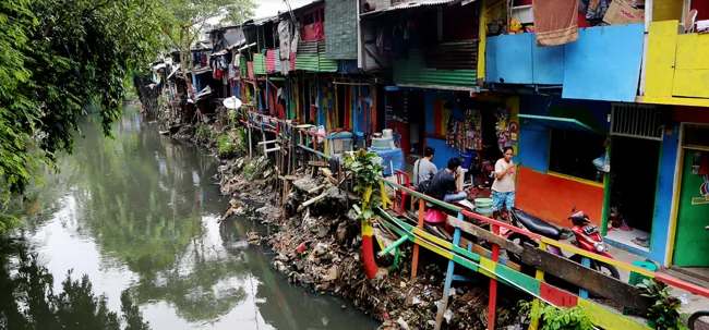 Дело в том, что трущобы… соревнуются за право быть выкрашенными. Известно, что в бедных районах Джакарты очень много мусора, а особенно вони, народ не стесняется мочиться на углы и заборы.