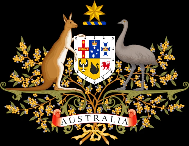Это герб Австралии, он был дарован стране королём Георгом V 19 сентября 1912 года. Кенгуру и эму, которые поддерживают щит, являются неофициальной эмблемой нации. Их изображение является признанием того факта, что они — представители австралийской фауны, которая встречается только на этом континенте. Парадоксально, но в 1932 году австралийцы вели настоящую войну со своим национальным символом – эму.