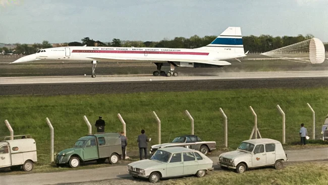 Тормозной парашют распускается из хвоста сверхзвукового авиалайнера «Конкорд», когда он катится по взлетно-посадочной полосе в аэропорту Тулуза-Бланьяк во Франции, 2 марта, 1969 года.