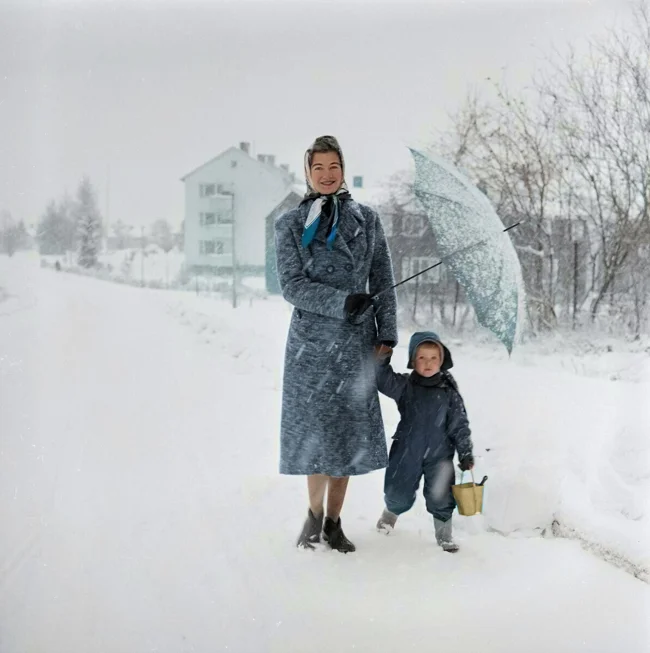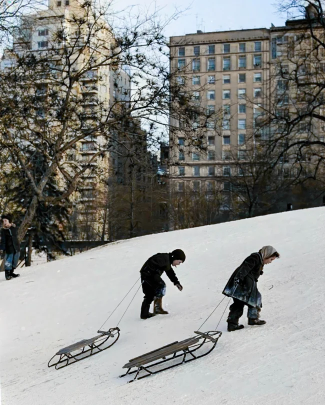 Дети катаются на санках в Центральном парке снежным днем, Нью-Йорк, 1954 год.