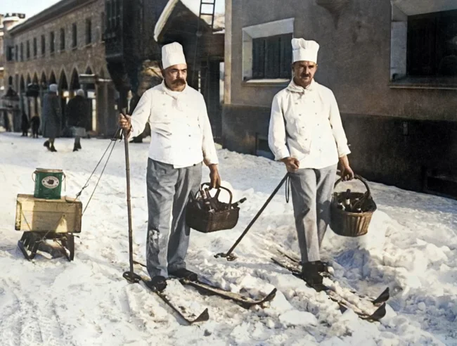 Два повара едут за продуктами на лыжах. Санкт-Мориц, Швейцария, 1930 год.