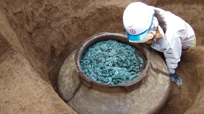 15. В Японии, к северу от Токио, на месте, где когда-то находилась резиденция самурая XV века, археологи обнаружили керамический кувшин с тысячами бронзовых монет