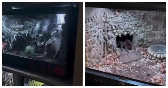 Парень превращает обычные террариумы для тарантулов в настоящие произведения искусства, создавая для восьминогих питомцев декорации по мотивам культовых фильмов. Каждый террариум посвящен отдельной вселенной — от жутковатых интерьеров из «Чужого» до мрачной атмосферы парижских катакомб.