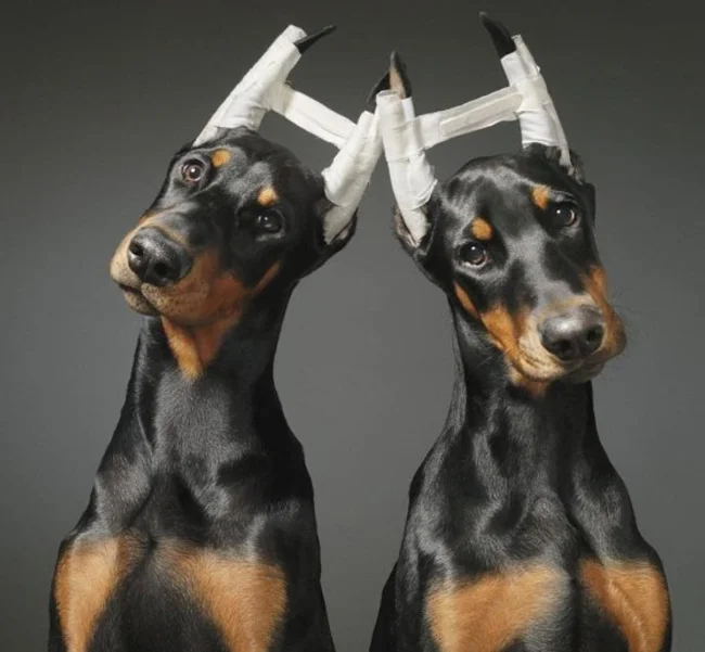 Именно поэтому люди начали практиковать процедуру купирования ушей у сторожевых и служебных собак. Одним породам купируют ушки в раннем щенячестве, как, например, алабаям и кавказским овчаркам. Другим же делают это в возрасте 2-5 месяцев. Служебным породам уши после заживления заматывают пластырем и укрепляют в так называемой «короне», чтобы те стояли торчком — вспомните доберманов, шнауцеров и боксёров.