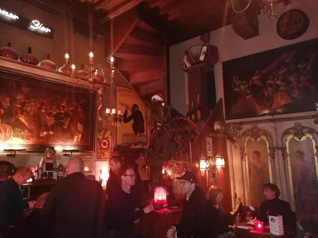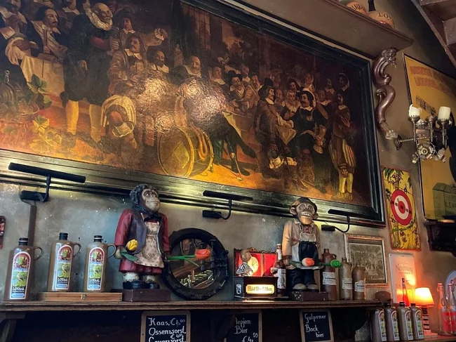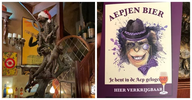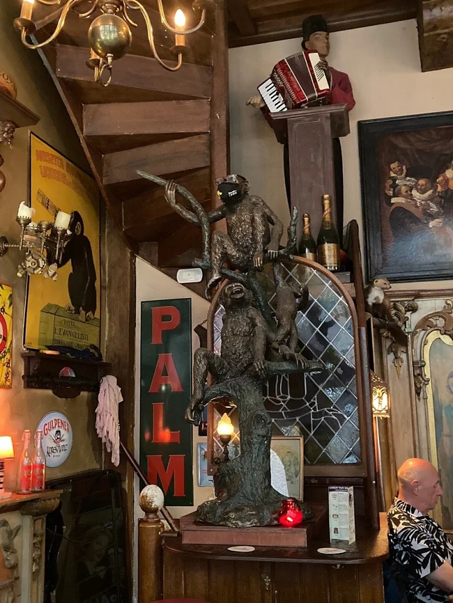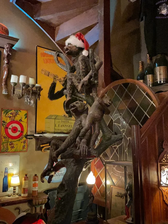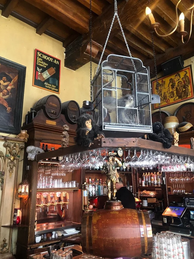 Сегодня почтенная старая таверна обильно украшена обезьянами: это резные статуи, винтажные плакаты и портреты маслом, висящие на барной стойке. Конечно, маловероятно, что у кого-то из современных посетителей заваляется в кармане пара обезьянок для оплаты счёта, но одно из старейших зданий Амстердама продолжает оставаться «В обезьяннике».