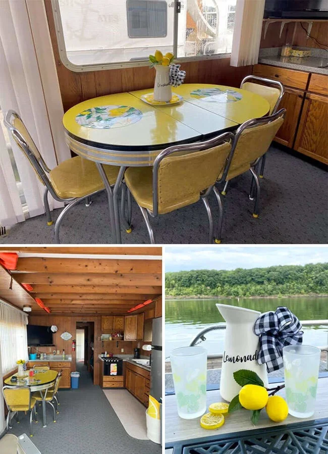 8. Мы купили плавучий дом и посмотрите, что оставили предыдущие владельцы! Горчично - желтый ретро обеденный гарнитур в идеальном состоянии