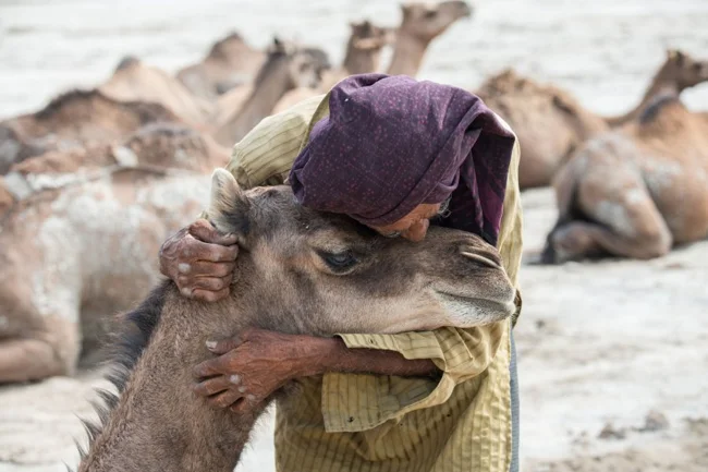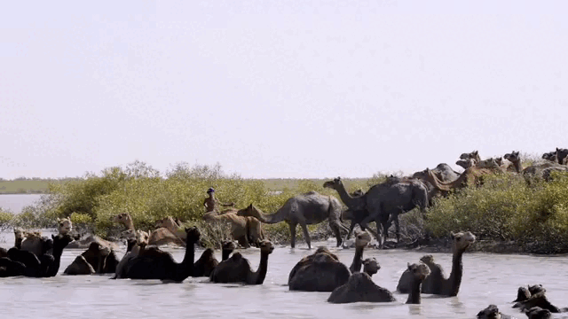 То, как гигантское стадо отправляется в путь, поистине впечатляет. Под внимательным взглядом погонщиков стадо из сотен верблюдов бросается в воду, чтобы пересечь пролив между островом и побережьем! Способность плавать для верблюдов неудивительна, они держатся на воде поразительно хорошо для кораблей пустыни. Но только хараи могут проплыть 10 километров за раз!