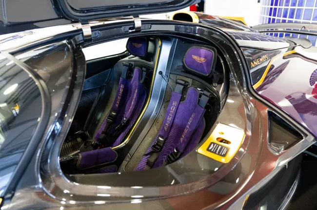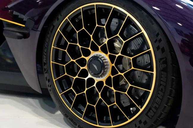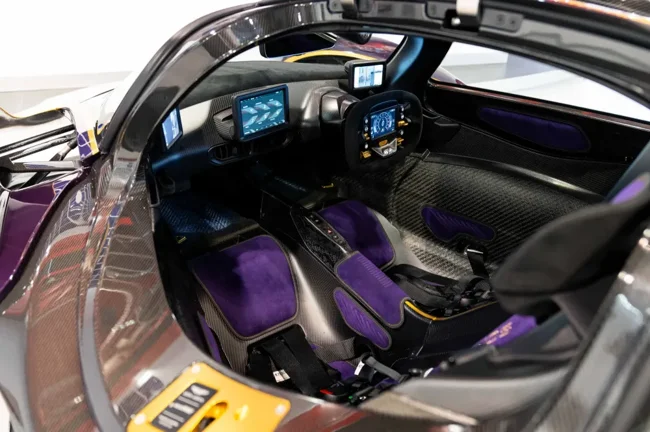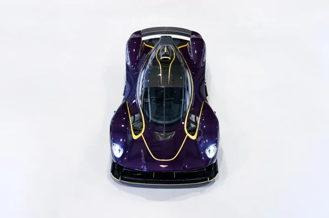 Карбоновый кузов Aston Martin Valkyrie имеет фиолетовый оттенок с вкраплениями металлических чешуек, придающих панелям особый блеск. Ключевые детали украшены золотом. Это, к примеру, передний сплиттер, пороги и контуры воздухозаборников. Кроме того, золотые вставки имеются в передней части и на диффузоре, а также в салоне гиперкара.