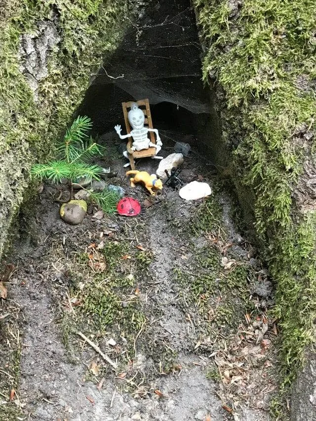 11. «Прогуливался по лесу и заметил этого симпатичного скелета и его питомцев, сидящих на террасе под деревом»