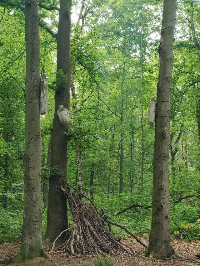 7. «Деревянные фигурки, висящие на деревьях в лесу неподалёку от меня. Думаю, надо найти новый велосипедный маршрут»