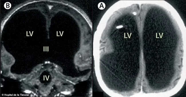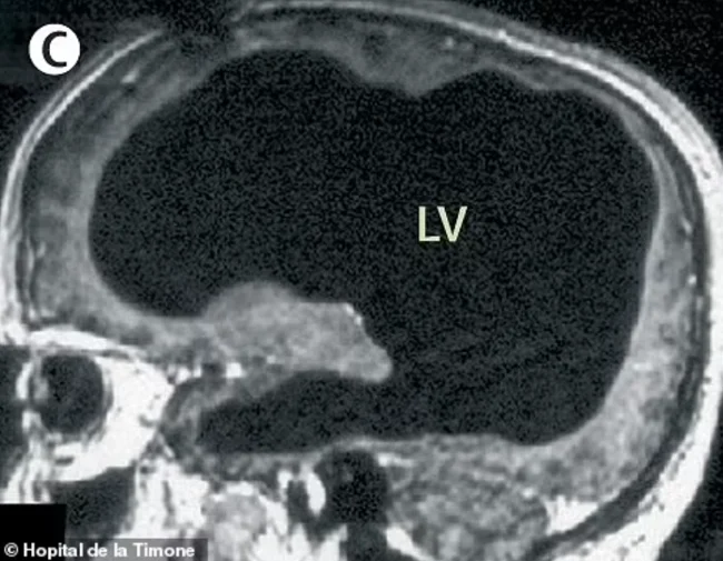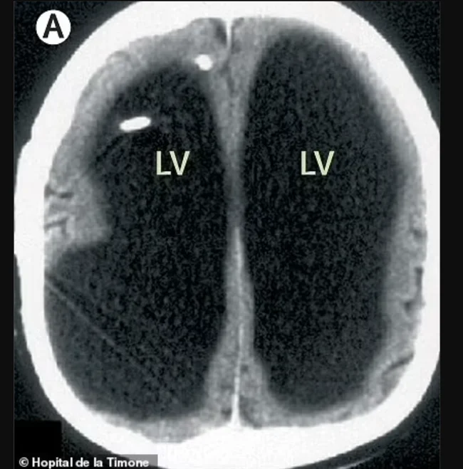 У пациента практически полностью отсутствовало мозговое вещество в черепной коробке, а остатки сжались в узкий слой и прижались к краям черепа. Оказалось, что с 14 лет в его мозге разрастался огромный карман жидкости (чёрная область на фото — жидкость), что привело к увеличению черепа.