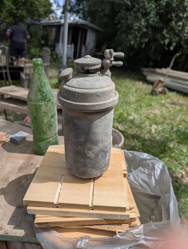 Старинный ручной огнетушитель, примерно сороковых годов. Такие огнетушители были распространены во время Второй мировой войны и часто использовались в целях гражданской обороны.