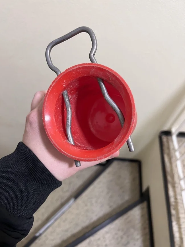 9. Маленькое красное пластиковое ведерко с небольшим изогнутым металлическим стержнем внутри, который можно двигать вперёд и назад