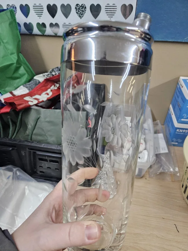 Винтажный стеклянный шейкер для коктейлей, со встроенными отверстиями для ситечка сверху. Обычно у него есть съёмная крышка, которая закрывает эти отверстия для встряхивания, а затем вы снимаете эту маленькую крышку, чтобы процедить напиток через ситечко.
