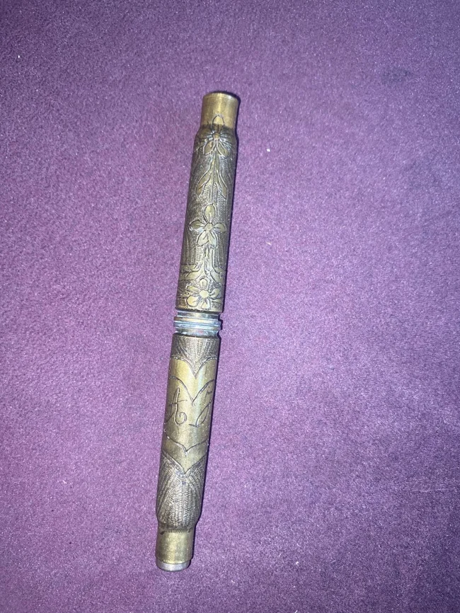 Это окопное искусство, две гильзы, намеренно сплавленные вместе. Солдаты вырезали рисунки на гильзах во время перерывов в Первой мировой войне.