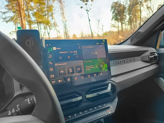 На этом же тачскрине в нижней части есть виртуальные «горячие» клавиши (подогрев руля, сидений, заднего стекла и т.д.). Это действительно удобно, потому что в отличие от многих современных авто, новый Дастер не нуждается в копании в меню, потому что все необходимое доступно из «первого прикосновения». Также отмечу, что есть беспроводная зарядка.
