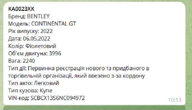 Этот номер находится в базе данных OpenData bot – он закреплен за купе Bentley Continental GT 2022 года с 4,0-литровым V8 твин-турбо.