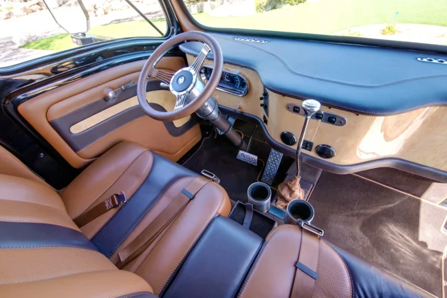 Конкретно этот грузовик тюнинговали – сменили решетку радиатора, расширили колею и установили новую грузовую платформу. Салон White 3000 COE украсили кожей и деревом, а также установили кондиционер, камеры кругового обзора и электростеклоподъемники.