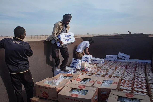 14. Торговцы загружают ящики с соком, бананами и кускусом