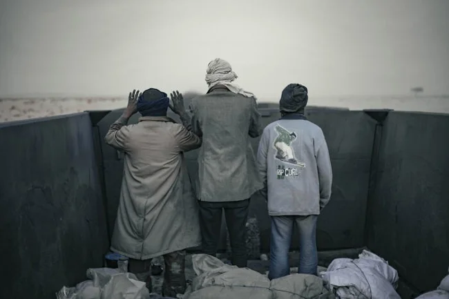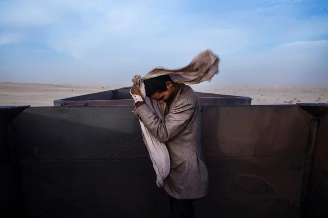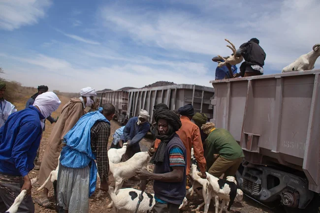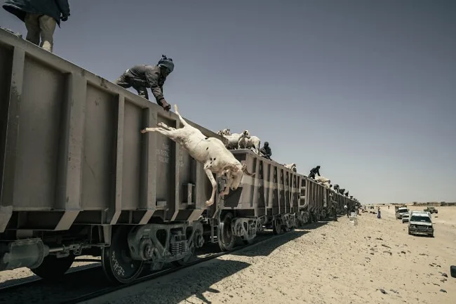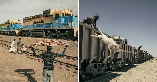 «Когда вы направляетесь из шахт Зуэрата в Нуадибу, пастухи загружают своих коз в вагоны, которые уже заполнены железной рудой. На этот раз поезд движется с особой осторожностью, ведь в каждом вагоне находится более 80 тонн руды. Пастухи быстро обустраивают своё пристанище на следующие 16 часов. Укрывают насыпь одеялами и сооружают небольшую печку, чтобы вскипятить воду для чая. Одна живая коза в Нуадибу стоит 100 евро. Когда животное приближается к краю, в неё бросают камень, чтобы она отступила назад. Несмотря на все усилия, некоторые всё равно падают, особенно в начале пути, когда они более возбуждены».