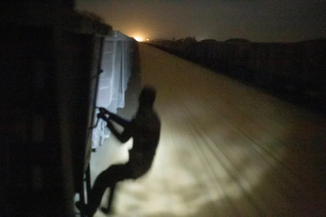 25. Мавританские подростки пробираются между вагонами поезда ![]()