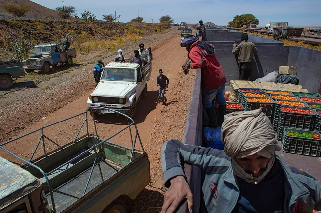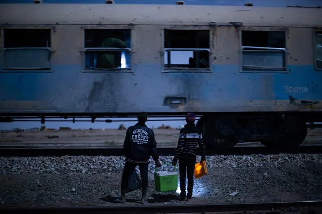 Две группы пассажиров ждут поезд. Женщины, семьи, пожилые люди и все, кто может позволить себе билет за 5 евро, занимают более комфортабельный вагон. Торговцы, пастухи и бедняки, с мешками риса, финиками, ящиками с фруктами и овощами, газовыми баллонами и ящиками с прохладительными напитками, выстроились вдоль железнодорожного полотна, готовые погрузиться в поезд, как только он прибудет. Я направляюсь к последним, надеясь подружиться с кем-нибудь и заснять их путешествие».