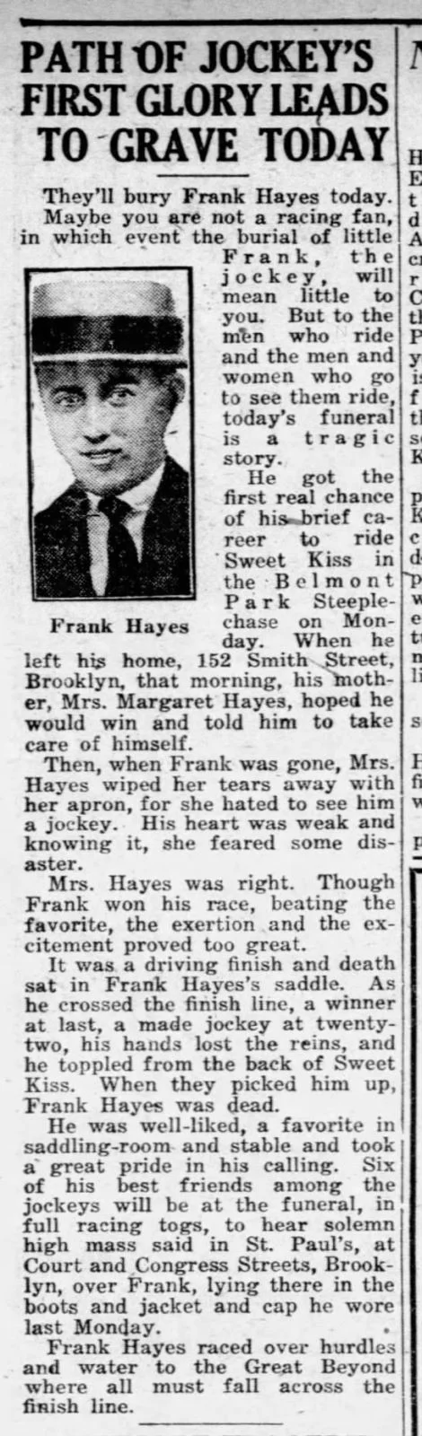 Фрэнка Хейса похоронили через три дня в полном гоночном облачении в присутствии шести самых близких друзей. В его некрологе газета The Times Union написала:
