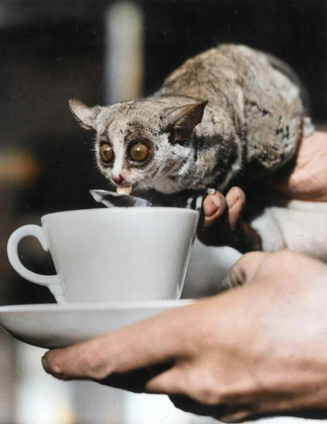 Южноафриканский галаго, в Лондонском зоопарке наслаждается утренним какао из чайной ложки, 1938 год.