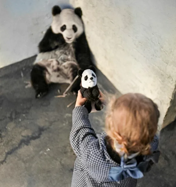 Маленькая Штеффи протягивает игрушечную панду настоящей панде в зоопарке Regents Park Zoo в Лондоне, 1946 год.