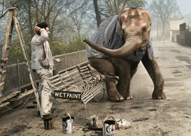 Слон по кличке "Дамбо", готовится сесть на скамейку, не обращая внимания на табличку «покрашено», вывешенную стоящим сбоку рабочим.