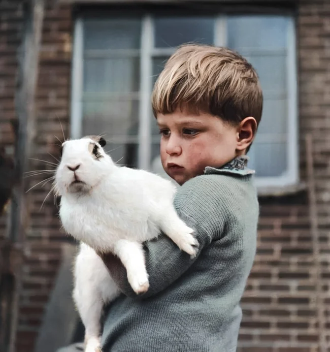 Мальчик сжимает в руках своего кролика, 1952 год.
