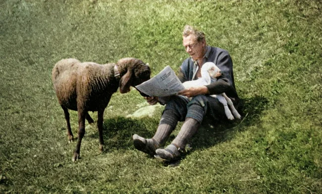 Мужчина читает газету в присутствии двух овец, 1939 год.