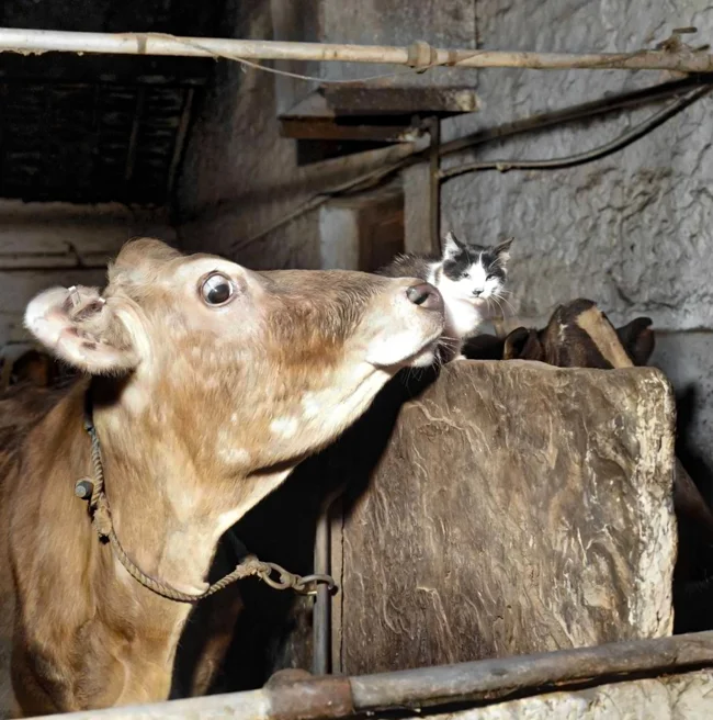 «Друзья», 1967 год.Из источника: Господин Артур Томпсон с фермы Ларк-Маунт около Бери, Ланкастер, задавался вопросом, куда на его ферме постоянно исчезал один из новорожденных котят. Только когда он заметил клок черно-белой шерсти на полу одного из стойл джерсейских коров, загадка была решена. Котенок крепко подружился с коровой Дженни и любил прижиматься к ней, когда она спала. У Дженни также появилась привычка облизывать маленького котенка, что также нравилось котенку. Теперь маленький котенок пристрастился сидеть на стене загона Дженни.