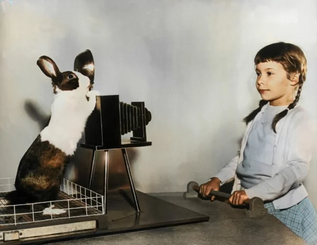 Кролик-фотограф, 1950-е.Это питомец родителей девочки Келлера и Мариан Бреланд, исследовавших поведение и психологию животных и создавших один или несколько зоопарков с дрессированными животными, фото с кроликами фотографами было одним из популярных аттракционов.