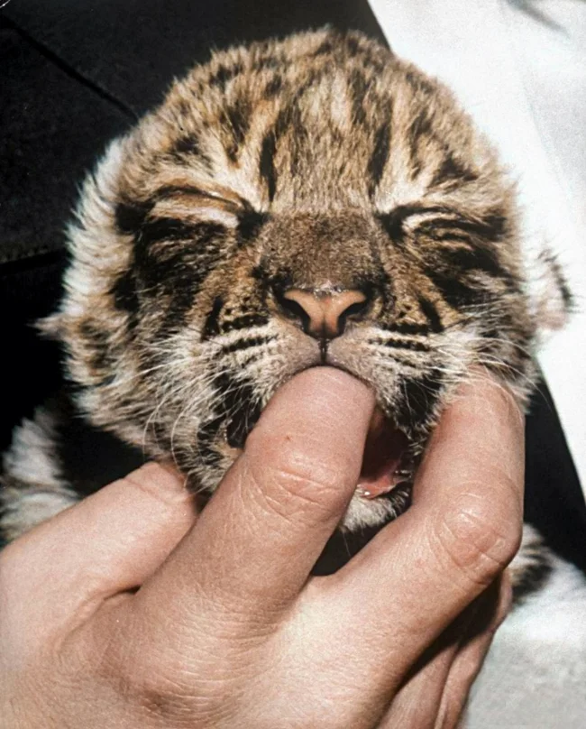 Маленький тигренок в зоопарке Нью-Йорка, 1944 год.Тигренок сосет палец, о нем временно заботится миссис Мартини, жена смотрителя льва из зоопарка Бронкса, поскольку тигрица не хочет кормить своего детеныша.