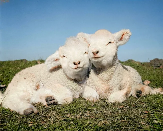 Два новорожденных ягненка лежат бок о бок и смотрят в камеру, 1940-е.