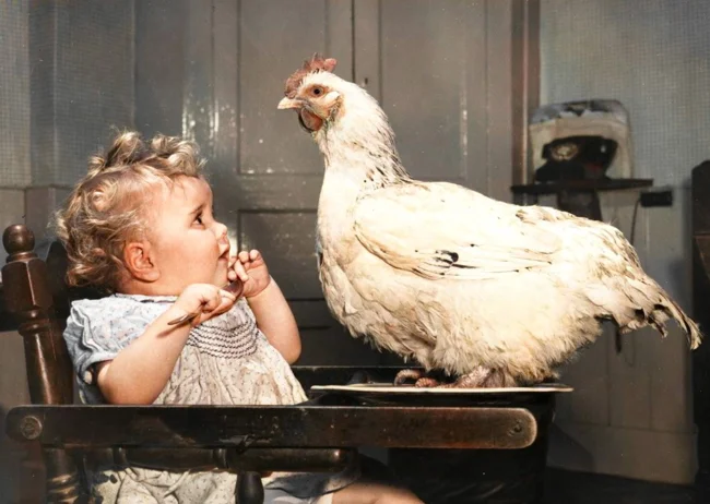 Живой ужин, 1955 год.Годовалая Сьюзан Бертон с живой курицей на обеденной тарелке