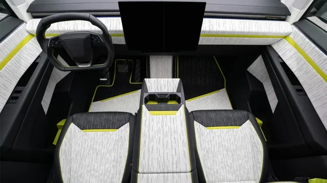 Салон пикапа полностью перешит кожей в необычной цветовой гамме с оригинальной перфорацией и украшен кастомными ковриками. Появились новые накладки на пороги из кованого карбона. Кроме того, для Cybertruck разработана дополнительная светотехника.