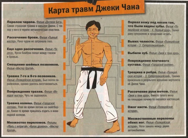 Травмы Джеки Чана во время съемок фильмов можно перечислять до бесконечности, поэтому предлагаю вам посмотреть на карту некоторых травм знаменитого актера.