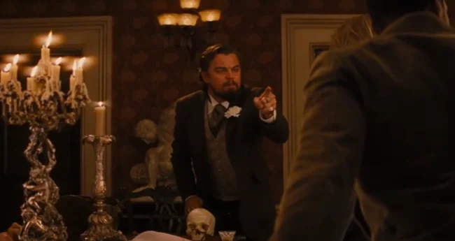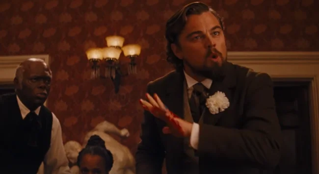 В сцене застолья Калвин Кэнди "слетает с катушек" и бьет кулаком по столу. Во время удара он разбивает бокал и сильно режется об осколки, после чего продолжает общение.